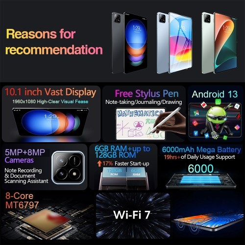 High Performance: The tablet is powered by an 8-core MT6797 processor and Android 13 for stable performance in both daily use and high computing tasks such as gaming or graphic drawing.