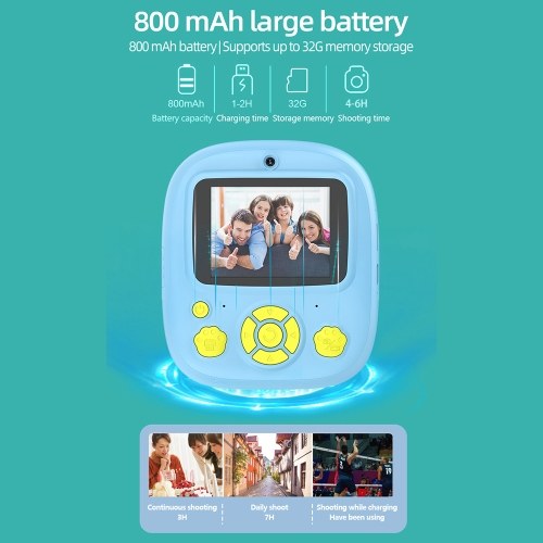 Durable Battery and Included Consumables: The camera features an 800mAh built-in lithium battery, offering up to 4-6hrs of shooting time. The package also includes 3 rolls of consumables, ensuring uninterrupted printing of your child's favorite memories.