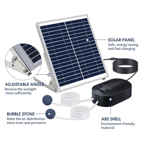 Just put the solar panel in a sunny spot and the solar oxygen pump starts automatically. There are three working modes to choose from, high gear, low gear, and intermittent mode. Suitable for a small to medium-sized pond, outdoor fish tank or water reservoir, etc.
