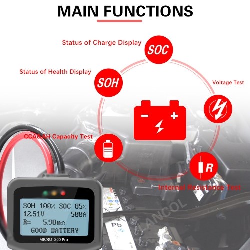 This product can quickly and accurately measure the actual cold cranking amps capability of the vehicle starting battery, healthy state of the battery itself, and common fault of the vehicle starting system and charging system, which can help maintenance personnel to find the problem quickly and accurately, thus to achieve quick vehicle repairing.