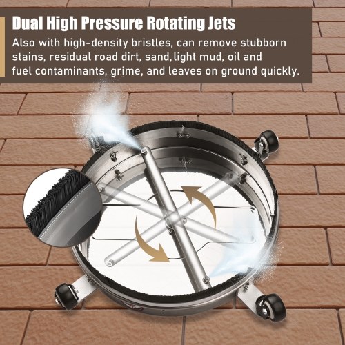 This cleaner works great and works exactly as described, it's about 16" in diameter for a good coverage area and the casters help with easy movement. The plastic housing is lightweight and the bristle skirt provides excellent spray and splatter control. The nozzle tip creates a good spray pattern and spin speed, and the 4000 PSI pressure makes cleaning quick and easy. Great for cleaning floors and patios, but not for uneven surfaces.