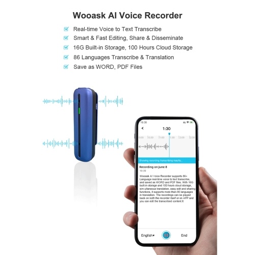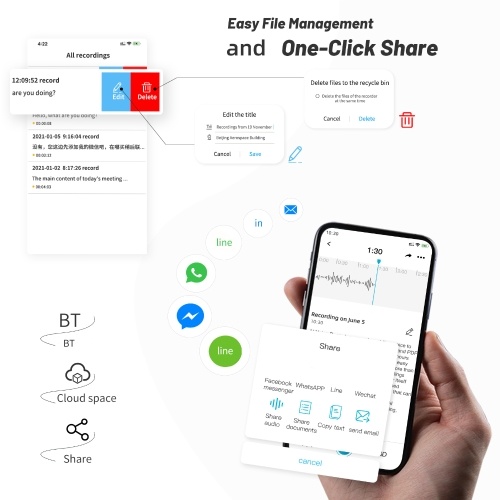 ★Accessible & Productive: The recordings can not only synchronize and save in your mobile phone via BT, but also can edit the time, location, name, so convenient for searching files next time. Recordings will be automatically saved to the cloud in your desired language, secures you from thieves and loss. When connect to the mobile APP or log in the cloud, you will have full control whenever to delete, edit and share.