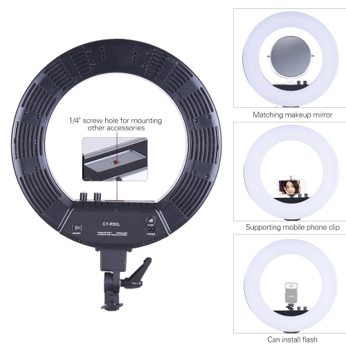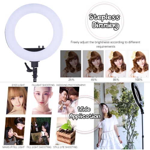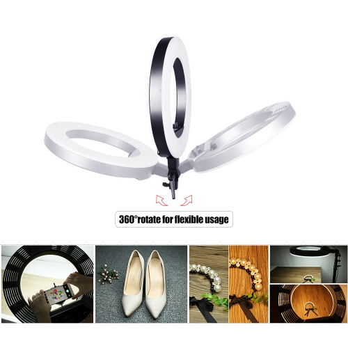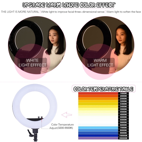 Ring-shaped designed, with eye protection LED lamp beads, low consumption, high brightness and 3200-5500K adjustable color temperature, this LED ring light will give you excellent shooting experience. You can use it as a fill-in light for pictorial shooting, network broadcast, wedding shooting, still lift shooting, etc. Comes with a 2m/6.6ft adjustable light stand for convenient usage.