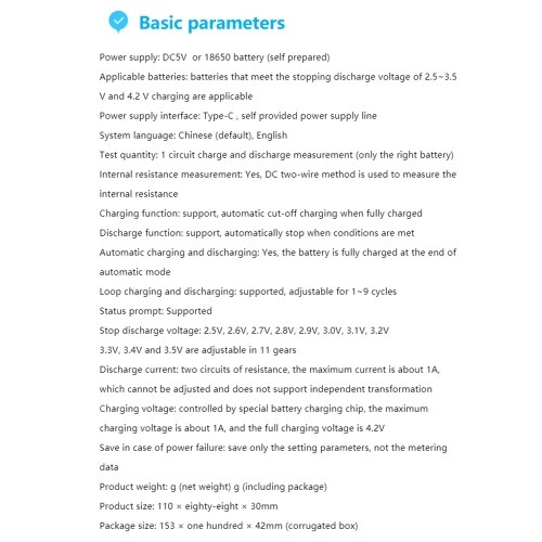 Digital Display: 1.77inch digital display, clearly display the real time voltage, real time current, real time power, accumulated capacity, accumulated energy, status indication, operating mode, stop discharge voltage, number of cycles, battery internal resistance and accumulated time.