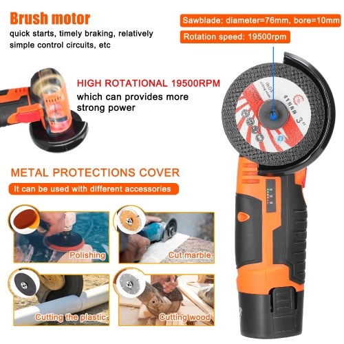 This versatile grinding tool has more stable and smooth performance and offers a long service time. A brush motor, quick starts, timely braking, relatively simple control circuits, etc. The high rotational speed of 19500rpm for reliable and productive work. It can be used for surface conditioning and grinding or iron cutting, as well as for home improvement, such as cutting and polishing tile, wood, stone, steel, etc.