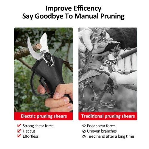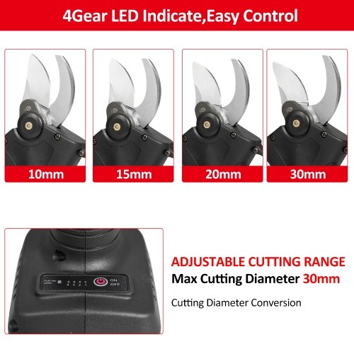 【Sharp & Strong Blade】Our Electric pruning shears can be quickly pruned, clean and flat, does not damage the branches.Blade is forged from the SK5 high carbon steel and powered by brush less motor, it is extremely sharp and durable, making it easy to cut 30mm branches. Electric pruning shears can be quickly pruned, clean and flat and does not damage the branches.