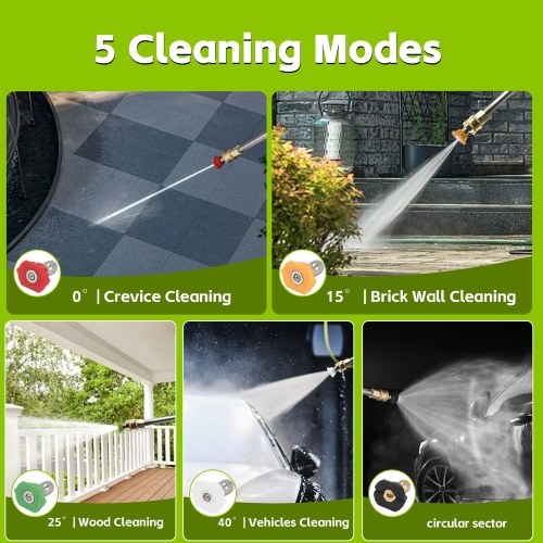 Adjust Pressure Nozzle: 4 Equipped with 4 different function nozzles (0º, 15°, 25º, and 40°), you can achieve different cleaning needs by adjusting the nozzle. Whether you need light, medium, or heavy-duty cleaning, using our adjustable pressure nozzles simplifies your cleaning process and achieves efficient cleaning results.
