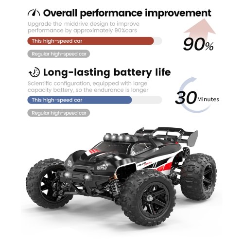 High-Speed Performance: Reach maximum speeds of 52km/h and enjoy all-terrain forceful high-speed performance. The large non-slip rubber tires offer strong grip and stability, allowing the remote-controlled car to conquer various terrains with speed and agility.