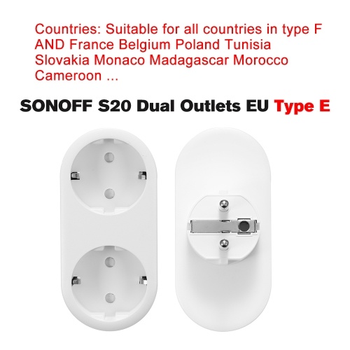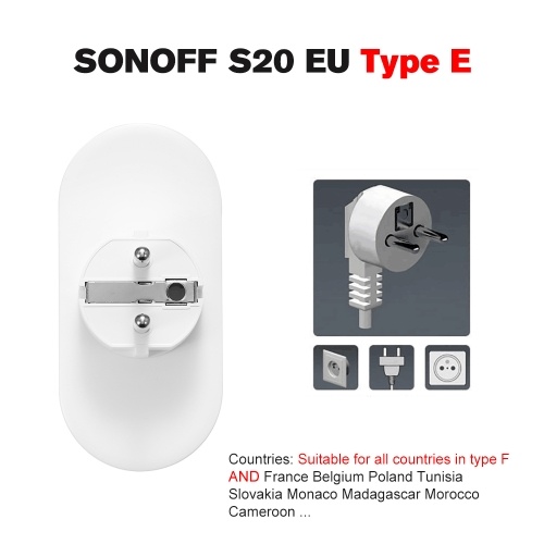 Note: SONOFF S20 EU Type E: Suitable for Russia/Germany/Italy/Denmark/Greece/Spain/Portugal/Netherlands/Hungary/Norway AND France/Belgium/Poland/Tunisia/Slovakia/Monaco/Madagascar/Morocco/Cameroon...