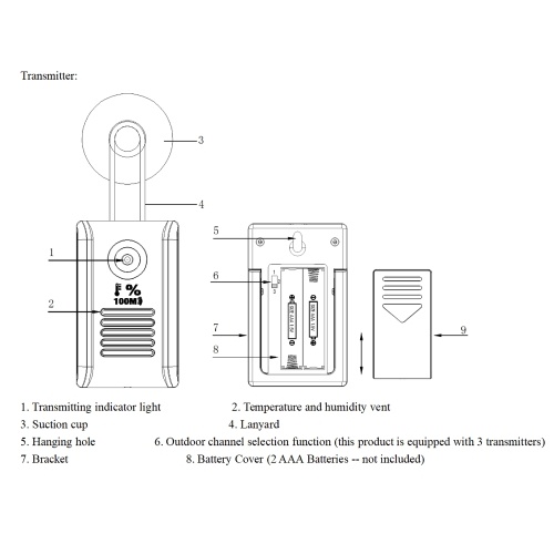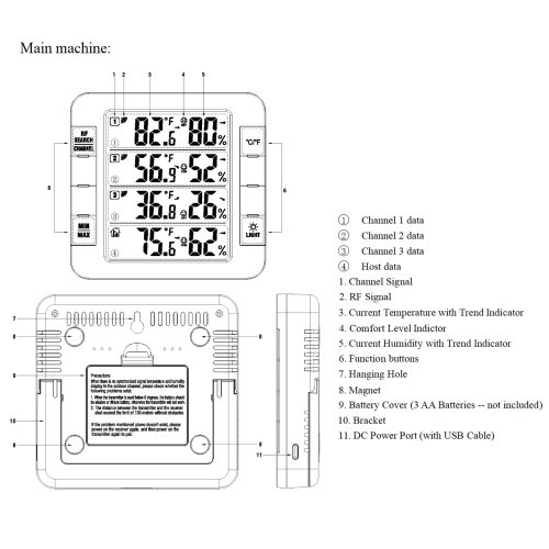 Large digital screen with backlight, more intuitive, clear at a glance; the backlight will auto off to save power. The main unit is powered by USB cable or 3 AA batteries; each sensor is powered by 2 AAA batteries. (Batteries NOT included)