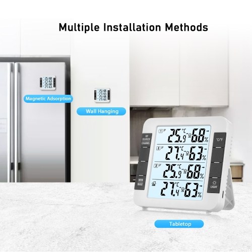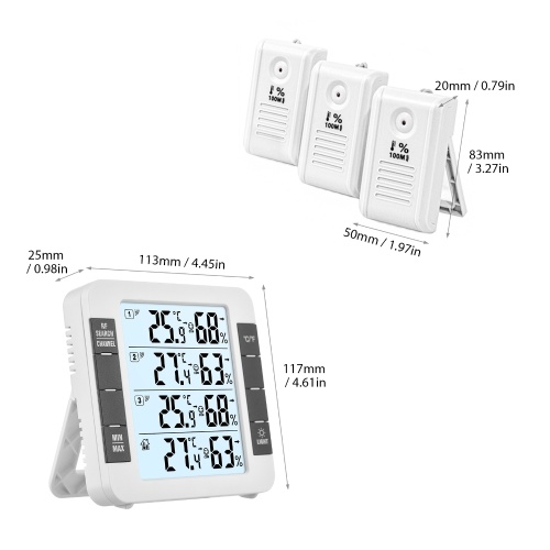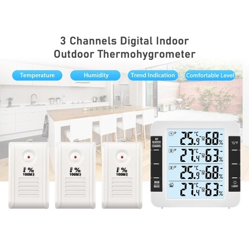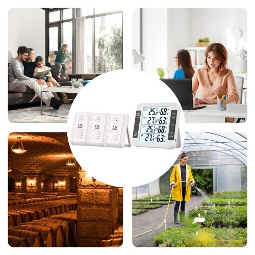 Digital thermohygrometer with 3 remote sensors of 100m sensing range without obstacle, it's accurate and can be widely used indoors and outdoors. A perfect choice of temperature and humidity monitoring for baby room, bedroom, study room, office, greenhouse, wine cellar, warehouse, etc.