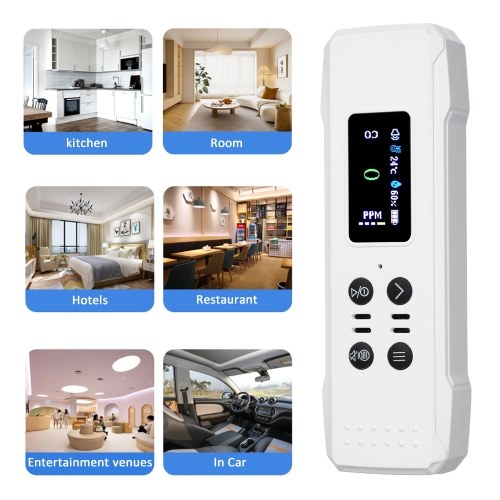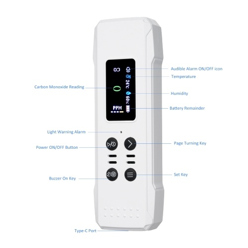 This product is a portable air quality (CO, temperature, humidity) detector, the product is small and easy to carry, high-end beautiful industrial design, built-in high-sensitive electrochemical sensor, strong anti-interference ability, will not be affected by other odors. It uses a powerful microprocessor with a TFT true color display. The display is delicate, and the buyer can customize the animated logo.