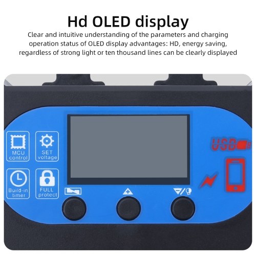 【User-friendly Interface】: The OLED high-definition display screen of solar panel controller provides clear and intuitive information about the charging status, battery voltage, and other relevant data. Users can easily monitor and manage their solar power system.