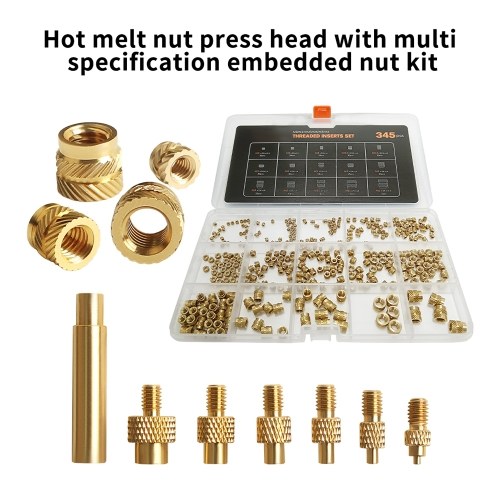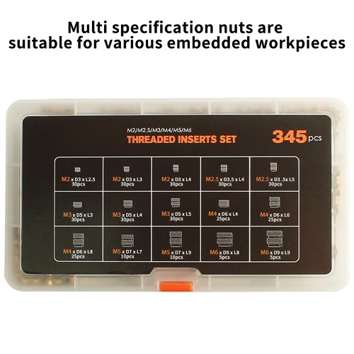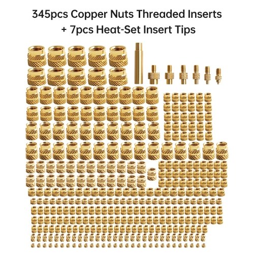 Useful Thread Insert Assortment Kit: This kit includes 345 insert nuts in sizes M2, M2.5, M3, M4, M5, and M6 internal threads, and 7pcs heat-set Insert tips. It is conveniently packaged in a plastic case for easy storage, adding to its practicality as a 3D printing accessory.