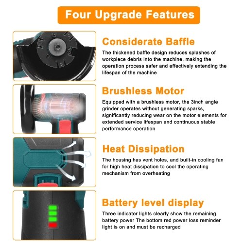 Equipped with a brushless motor, it operates without generating sparks, significantly reducing wear on the motor elements for extended service lifespan and continuous stable performance operation. Providing high rotation speed, this tool excels in quick material removal, saving time and effort while guaranteeing reliable and efficient results in various grinding and cutting tasks. It can be used for surface preparation, grinding and cutting tasks, and home improvement tasks such as cutting and polishing tile, wood, stone, and steel.