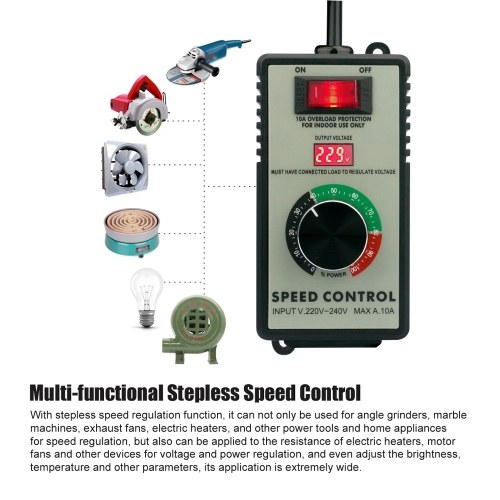 This angle grinder speed controller is a versatile electronic voltage regulator and speed controller with multi-function, safety, and convenience. With stepless speed regulation function, it can not only be used for angle grinders, marble machines, exhaust fans, electric heaters, and other power tools and home appliances for speed regulation, but also can be applied to the resistance of electric heaters, motor fans and other devices for voltage and power regulation, and even adjust the brightness, temperature and other parameters, its application is extremely wide. With its strong functional compatibility, safety protecting mechanism, precise voltage regulation capability, and humanized design, it has become a very cost-effective and practical speed controller product.