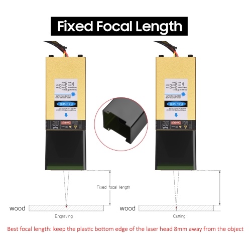 It has fixed focal length (best focal length: keep the plastic bottom edge of the laser head 8mm away from the engraving object). Made of premium quality aluminum alloy casing with great durability.