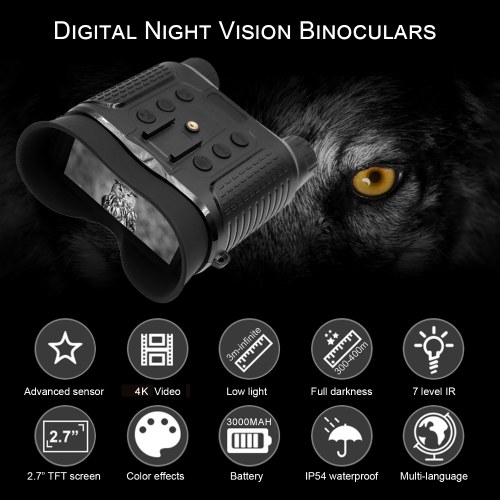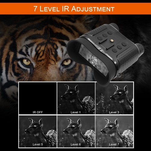 This night vision binocular features 6.5X eyepiece magnification, 8.5° wide field of view, and 1.3mp sensor to provide crisp clear images and videos on the 2.7" TFT screen which supports 8x digital zoom and 7-level brightness adjustment. With 850nm IR illuminator, you can see your target 350-400 meters far away instantly. The binocular is IP54 waterproof, lightweight and compact, very convenient for head mount use. It is a great device for?cave searching, security, hiking, night fishing, hunting, wildlife watching, etc.