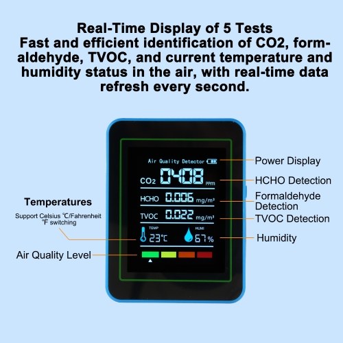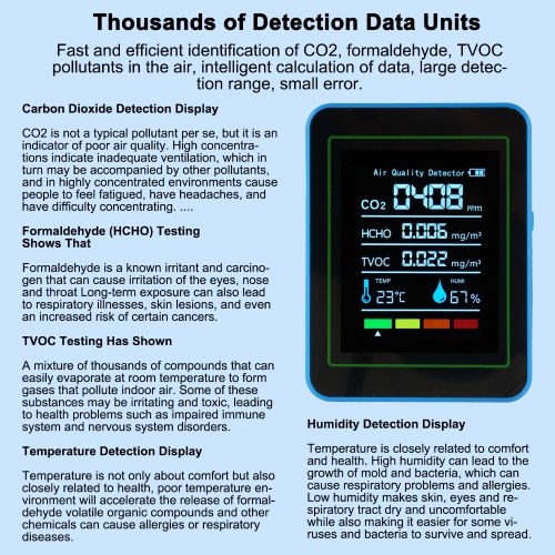 Wide Application: This portable intelligent home air quality meter can detect air quality in bedrooms, living rooms, kitchens, cellars, cars, grow tents, offices, schools, hotels and more. it can be placed on the desktop for easy viewing, is an ideal indoor air quality detector for our lives.