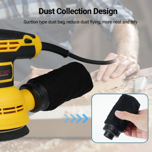 【High Dust Collection Efficiency】This electric sander has 8 vacuum holes; The dust bag has higher dust collection efficiency than the dust box; Dust bag has air permeability, it can prevent dust from entering the motor again, extending the service life of the orbital sander.