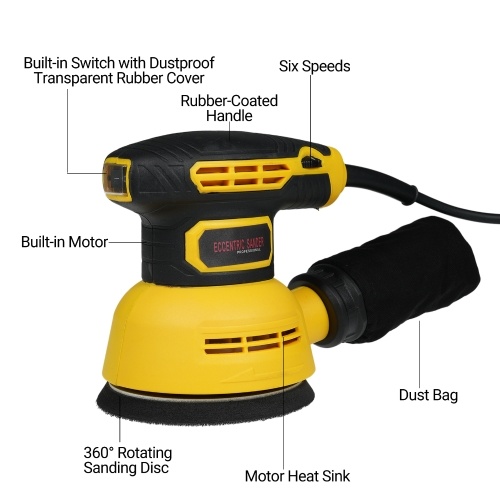 【Rubberized & Ergonomical】The sander machine is small in size, light in weight; it is wrapped in soft rubber to reduce vibration and improve comfort; handheld design, easy to operate with one hand. Orbital sander can revent hand numbness, and reduce fatigue caused by long-term use.