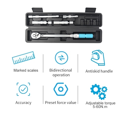 This torque wrench is a precision instrument intended to be used only to tighten screws, bolts and nuts to a desired torque. With 5 to 60N.m adjustable torque and dual ratchet direction, it can be widely used in automotive repair, mechanical and electrical maintenance, furniture installation, power engineering, manufacturing industry and so on.