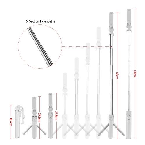 Adopt 5-section extendable design, its working height: 21.6cm~68cm. You can easily adjust it to the desired shooting height.