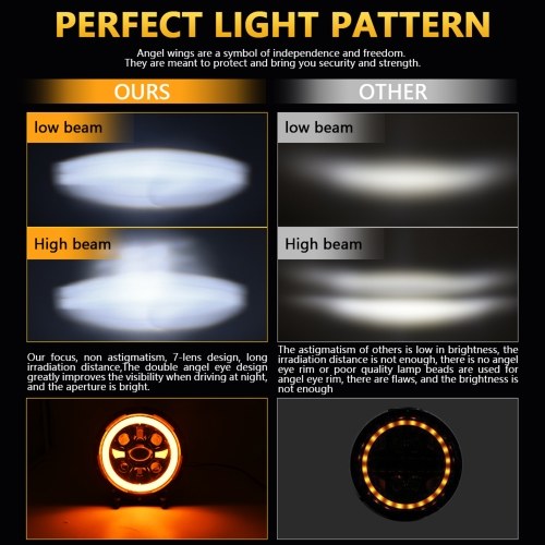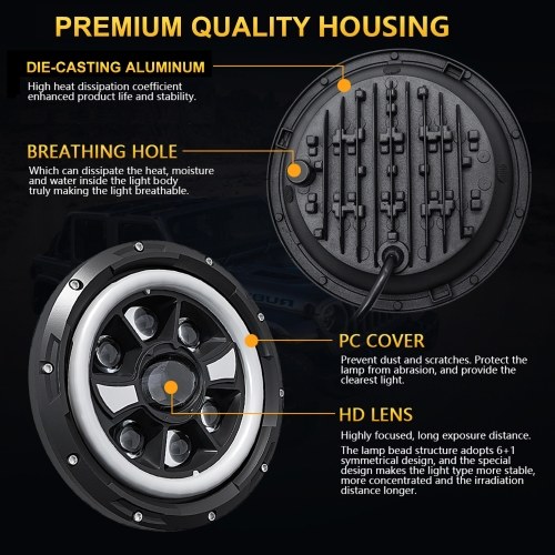 Premium Quality: 7 inch LED headlight made of die-casting aluminum, sturdy and durable, and have excellent heat dissipation performance, fully sealed and effective waterproof, so this 7'' led motorcycle headlight has a service life of more than 50,000 hours. The design of the ventilation holes on the back of the lamp body can effectively remove mist.