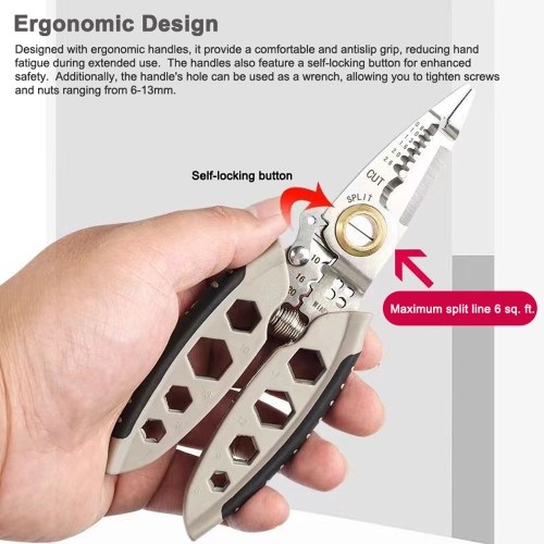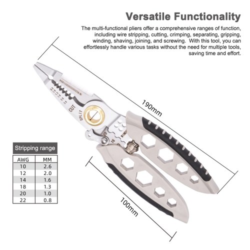 Introducing the 7-inch multi-functional wire stripping pliers, designed to simplify your work by offering a wide ranges of function in a singles tool. With its versatile capabilities, this tool allows you to strip, cut, crimp, separate, grip, wind, shave, join, and screw, eliminating the need for frequent tool changes and significantly improving your work efficiency. Crafted with accuracy and durability in mind, this tool is suitable for industrial, electrical, and household applications, providing exceptional performance and convenience.