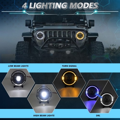 4 Lighting Modes: With 4 lighting modes available, including high beam (white), low beam (white), daytime running light (blue-to-white gradient welcome animation), and turn signals (yellow), the round headlights are a perfect replacement for traditional halogen lights and can meet various driving requirements.
