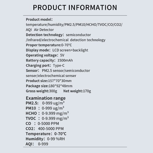 9 In 1 Air Quality Detector: This detector can detect the temperature, humidity, PM2.5, PM10, HCHO, TVOC, CO, CO2, AQI for you at one time, you can view the data you care about at any time.