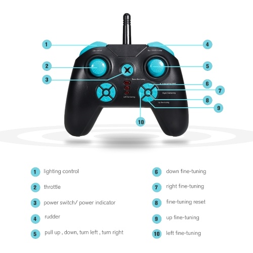 The three-channel remote controller increases the control distance up to about 200 meters, which supports a farther flying distance. The remote controller makes distinctions between small and large rudder. The small one is suitable for beginners. With the controller in the large rudder state, if you keep moving the joystick up and down, the aircraft will make a head rotation.