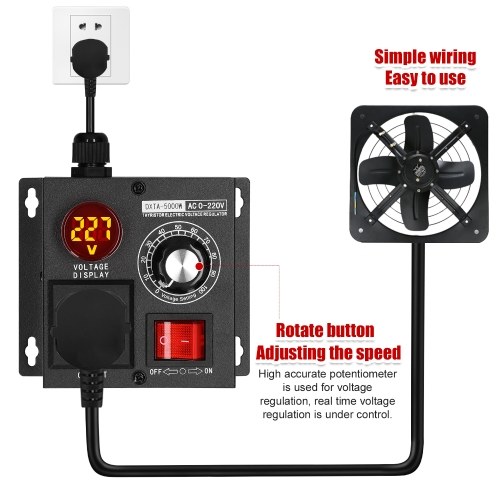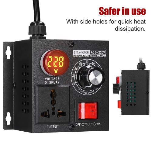 The thyristor electronic voltage regulator is mainly used for resistive loads (incendescent filament, incandescent lamps,etc.), monophase A-C brushless motor, adjustable pressure range from 20Volt-220Volt, suitable for low voltage drive heaying wire. Factory use: such as cuttings tyrofoam, pearl cotton, raincoats, make it to adjust the voltage, reduce power and so on. With the bi-direcyional high-power thyristor, the current is up to 40amps, which solves the over-current problem caused by the electric resistance of the electric furnace wire when coolingis too small; it can easily adjust the output voltage of the mains at 10Volt-continuously adjustable between 220Volt, 0 delay, 0 hysteresis. Use case: Heat regulation of electric stoves and water heater, dimming of lamp and lantern, small motor speed adjustment, electric iron thermostat and so on.