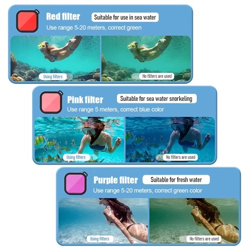 【Optical Filter Set】Enhance your footage with three optical filters. The red filter is ideal for capturing vibrant colors in saltwater environments, while the pink filter is perfect for snorkeling in the sea. The purple filter is specifically designed for freshwater use, allowing you to capture stunning visuals in lakes and rivers.