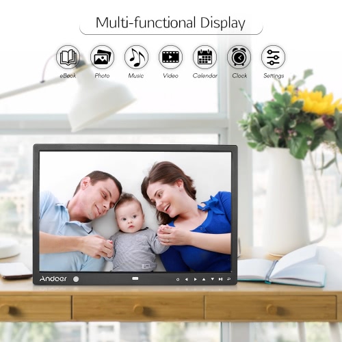 Andoer 15" large screen multi-functional digital photo frame! It can not only display photos you like, but also play music/ video, and support alarm clock, calendar and eBook functions. With built-in motion detection sensor, which makes it turn on automatically when detects movements, more energy-saving. Touch keys control and remote control design allow you to operate the digital photo frame easily and conveniently. Display every happy moment!
