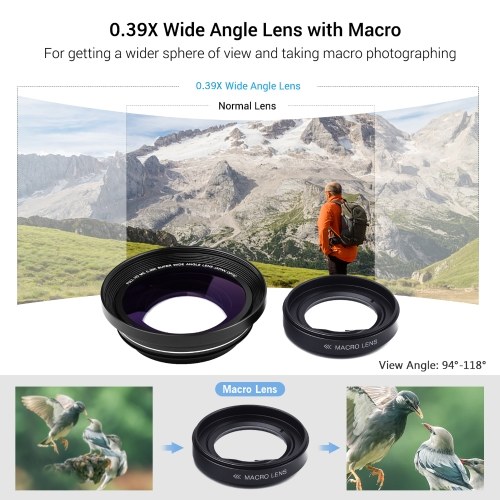 0.39X Wide Angle Lens:Big view of 94°-118°, support wide field of vision. Emphasize the perspective effect of the picture, intensify the depth of the scene, to achieve a considerable clear image.