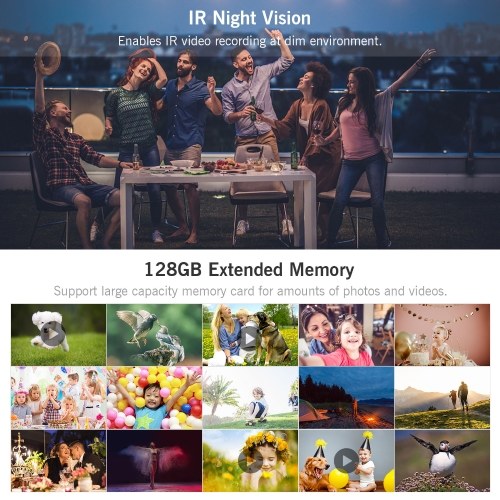 Powerful Functions:Support WiFi connection for quick videos and photos sharing with phone, IR night vision recording, LED digital light, anti-shaking, time-lapse and slow motion recording, motion detection, self-timer, white balance setting, support Max.128GB external memory card.