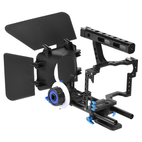 Super compatible metal camera cage. Really portable and lightweight and easy to put together. Convenient to carry with the handle bar and mount with the quick release plate. It's padded so it's comfortable and durable. I can adjust the height along several points on the vertical bracket and I can mount my camera inside forward or back. The siding is made with indented framing fir fingers so it fits well within my hands. Has so many thread holes for holding other devices, this cage can pack a lot of heat! Works really well!