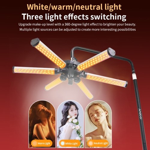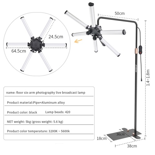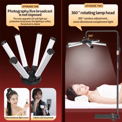 【6-Arm Floor Fill Light】Featuring 6 arms design, equipped with 420pcs bi-color temperature lamp beads, and boasting a high color rendering index of 90+, this floor beauty lamp is perfect for various applications, such as desktop vlogging, beauty salon live streaming, and beauty projects.