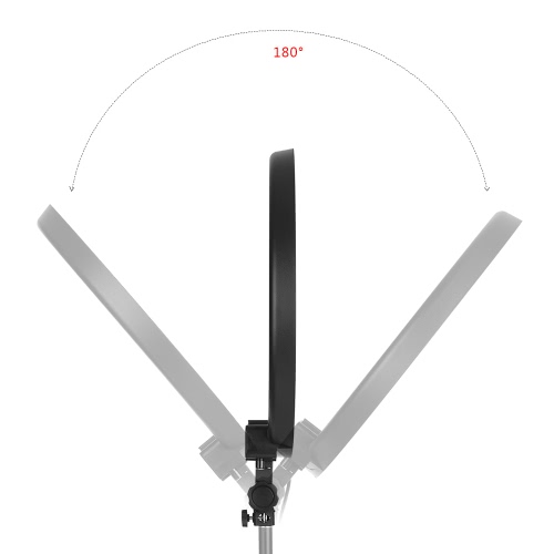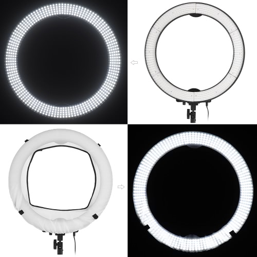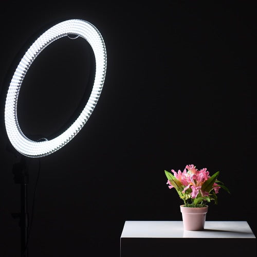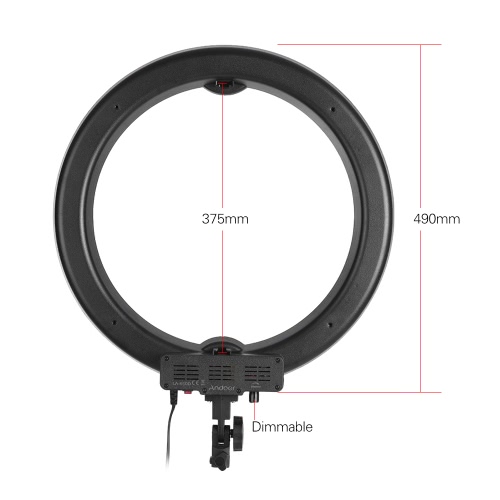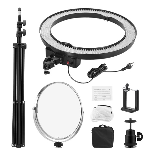 Andoer LA-650D 480mm/18.9inch LED ring light kit includes 40W light + 2m/6.6ft metal light stand + mirror + mini ball head + smartphone clip + soft cloth + carry bag. The light is made of 600pcs high quality LED beads and gives out 5500K non-flicking soft light. Brightness stepless dimmable.