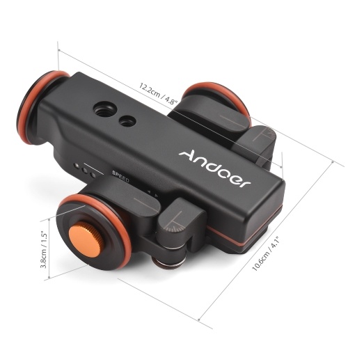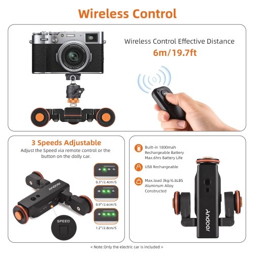 3 Speeds Adjustable: The motorized camera dolly with scale indication supports 3 levels of adjustable speed(2.4 cm/s, 2.6 cm/s, 2.8 cm/s), ultra low noise and stable movement.