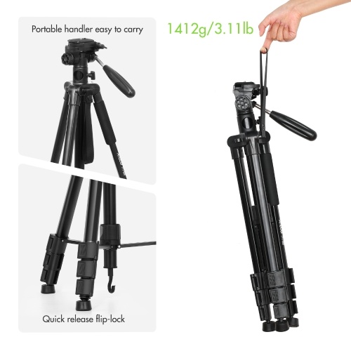 Portable Photography Tripod: Made of aluminum alloy material, net weight is about 1412g/3.1lbs, lightweight but durable; and the folded height is only 57cm/22.44in, easy to carry, suitable both for indoor and outdoor photography.