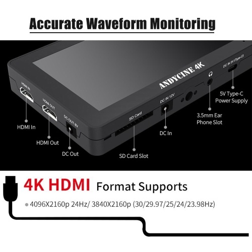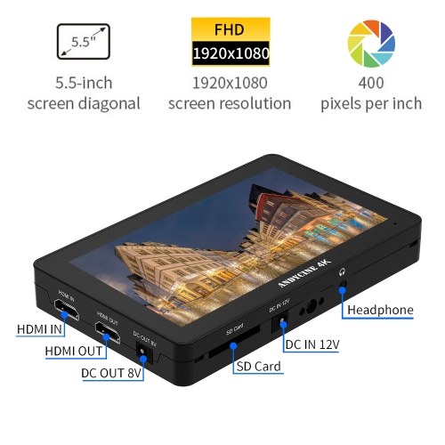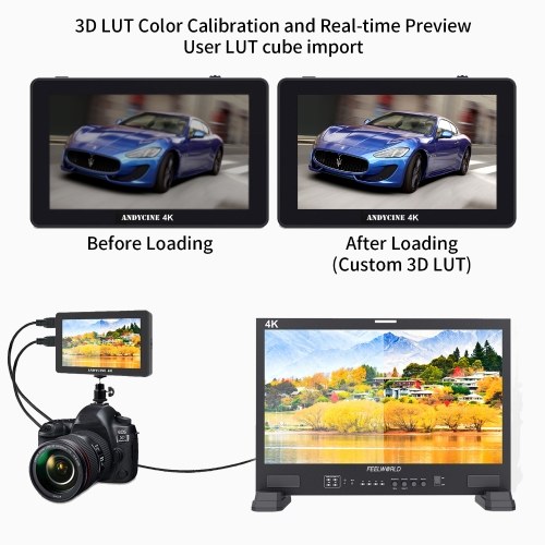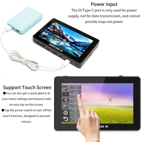 【4K Camera Field Monitor】The field monitor featuring 5.5 inch IPS touch panel, 1920x1080 native resolutions, 460nits brightness, 1000:1 contrast, 170° wide viewing angels, supports 4K HDMI input for live viewing your image or video, and HDMI loop output offer the decondary HDMI monitor connections. The monitor can load 3D Lut files via the memory card slot.