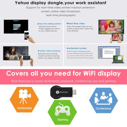 Supports E-learning, business meeting: Wireless Display, from out of the shackles of cable, the meeting has become intelligent and efficient. Perfect for Business and Education presentation (PowerPoint, Excel, Word, PDF and Pictures from your Smartphone, Tablet PC to HDTV, Monitor and Projector with HD input port). With compact portable deign for easy carrying.AnyCast M2 Plus uses compact portable deign for easy carrying.