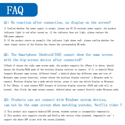 Note 1:The WiFi Wireless Display Receiver uses Miracast standard Protocol. Due to the Netflix and YouTube videos which are encrypted, the product will cannot achieve the function of projecting your Smart Phones / Tablet PC to another big screen devices.