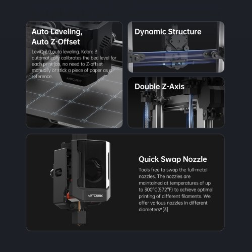 Multicolor Printing & Revolutionary Performance: LeviQ 3.0 Automatic Leveling: Kobra 3 automatically calibrates the bed level for each print job, no need to Z-off set manually or stick a piece of paper as a reference. Kobra 3’s dynamic structure features double metal spindles and SG15 bearings, for smooth and reliable printing performance even at high speeds.