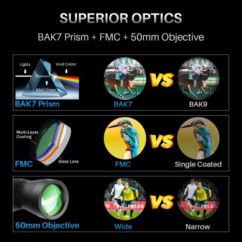 【FMC Lens & BAK7 Prism】FMC green film keep colors true and with high light transmittance, clear and sharp imaging, which can effectively reduce eye fatigue; BAK7 prism make the image brighter and more transparent without dark edges.