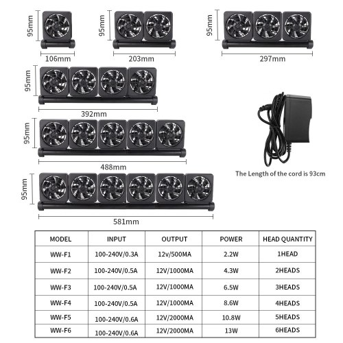 This aquarium cooling fan is capable to reduce water temperature and drop up to 2 ~ 4℃, meeting the daily use of fish tanks. There 1 to 6 heads fans for you to choose in accordance with your demands.