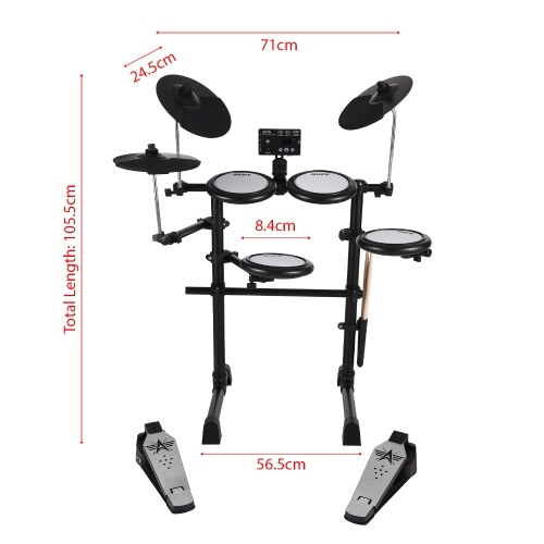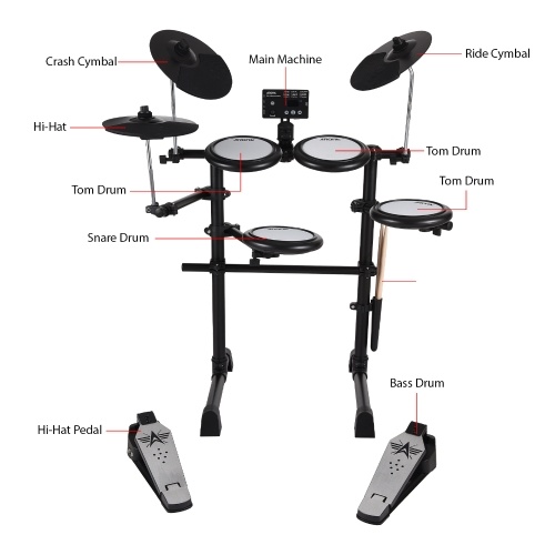 Drum Kit Contents: Crash cymbal,hi-hat,ride cymbal,tom drum 3,snare drum,hi-hat pedal,bass drum pedal