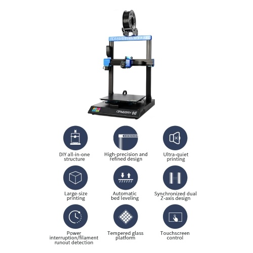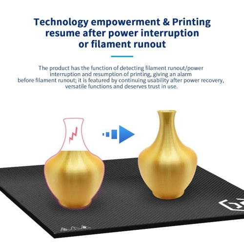 [Resume Printing & Filament Detection] Featuring the function of detecting filament run out/power interruption and resumption of printing, giving an alarm before filament run out; it is featured by continuing usability after power recovery.